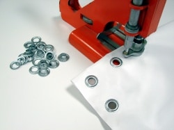 Монтаж люверсов выполняют сайнмейкеры или сами производители рекламного продукта. Элементы распределяют по краю уже готового баннера. Расстояние между проколами зависит от веса изделия и его размера: обычно выдерживают дистанцию 30-40 см для равномерного натяжения ткани.
